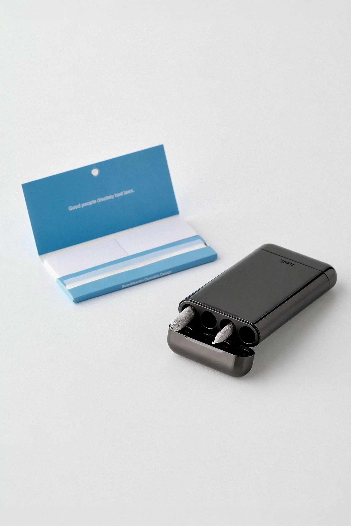 The Carry Case is a pocket-sized statement piece, thoughtfully designed to carry your cones at all times. Crafted in anodized and hand-polished aluminum and equipped with a firm magnetic lid. It also features an airtight base compartment where you can discretely store your half-smoked cones. Fits four king-size cones perfectly.